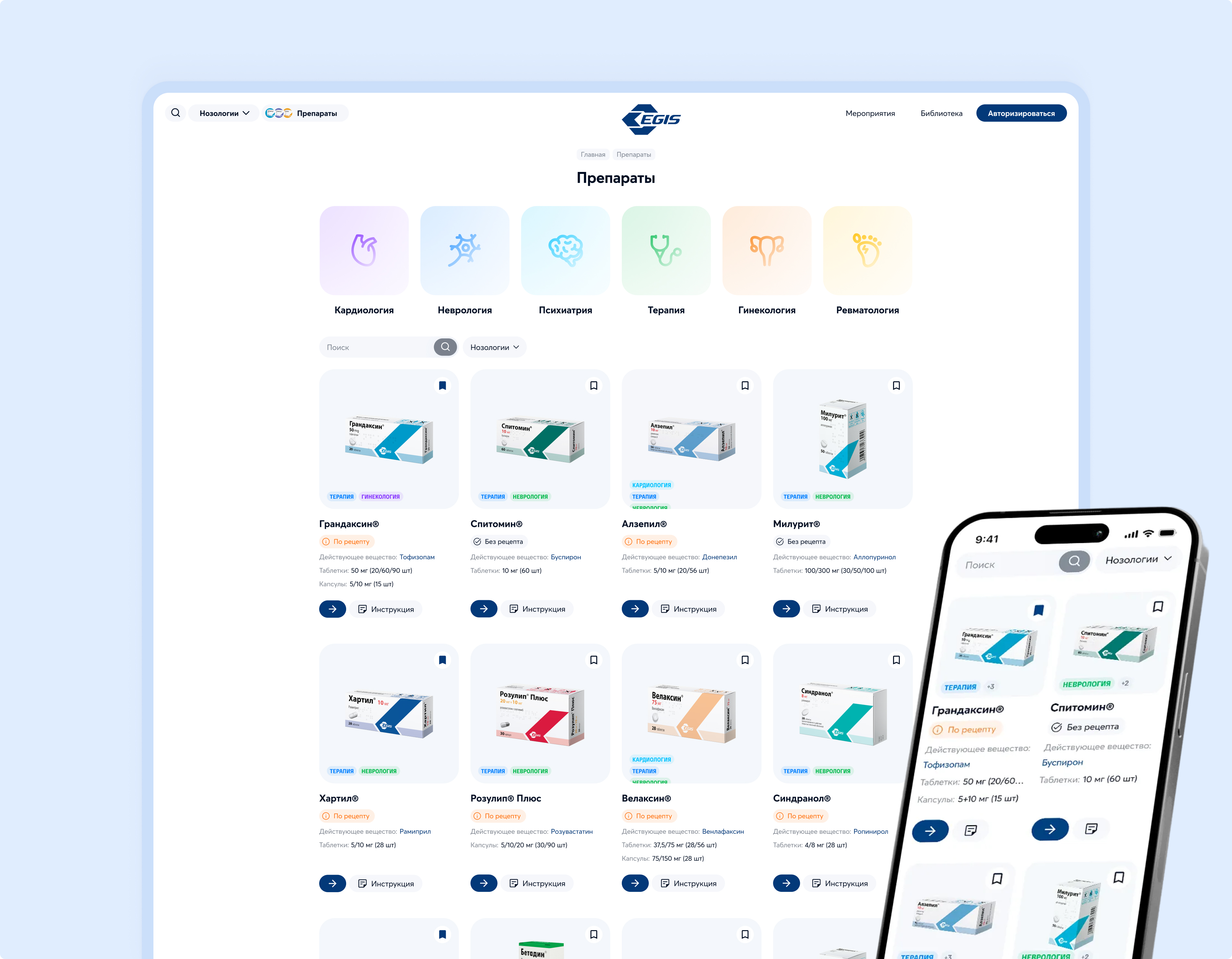 Создали удобный и понятный каталог препаратов с фильтром по нозологиям и возможностью поиска.